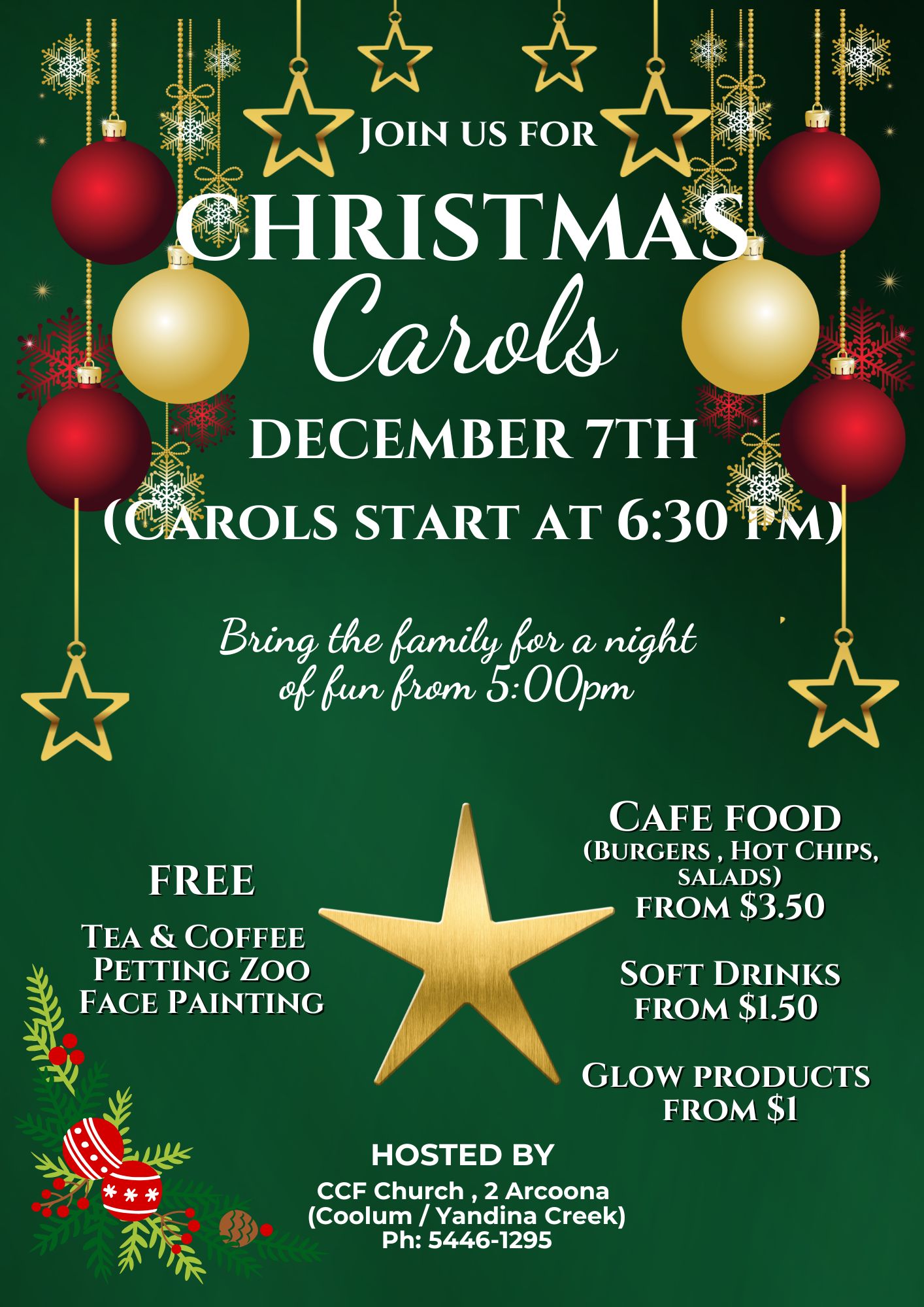 CHRISTMAS CAROLS here at CCF Church – 2 Arcoona Rd, Yandina Creek (Coolum)